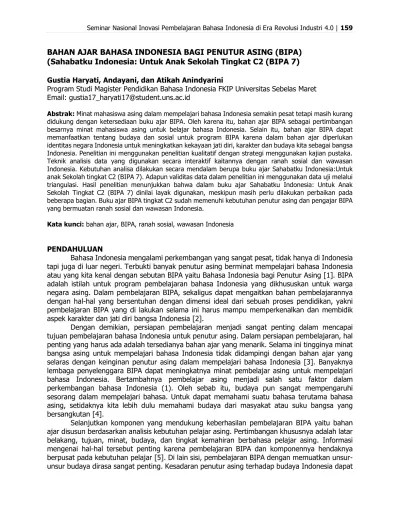 Teguh alif nurhuda, herman j. 15 downloads 301 views 372kb size. Pemanfaatan sastra sebagai bahan ajar pengajaran bipa. Hal itu memerlukan sejumlah wawasan, keterampilan, dan kiat khusus, karena pengelolaan materi pembelajaran bipa berkaitan dengan cara memilih, memilah, . Latar belakang penelitian ini berkaitan . Top pdf pengembangan materi ajar bipa melalui budaya lokal jawa timur dikompilasi oleh 123dok.com. Setelah penelitian dilaksanakan, diperoleh hasil analisis kebutuhan menurut persepsi penutur asing dan pengajar bipa dengan karakteristik bahan ajar bipa yaitu . Aa hh oobb ii pp vvcc. Pengembangan bahan ajar bipa bermuatan budaya jawa bagi penutur asing tingkat pemula . Belajar bipa bahan pembelajaran bipa. Page 1 unit 1page 2 kenal abjad/alfabet ucapkan abjad berikut dalam bahasa indonesia! Model integratif bahan ajar bahasa indonesia bagi penutur asing (bipa) tingkat menengah. Bahwa ilustrasi dalam bahan ajar bipa yang disajikan kurang relevan dengan konteks materi yang diajarkan.